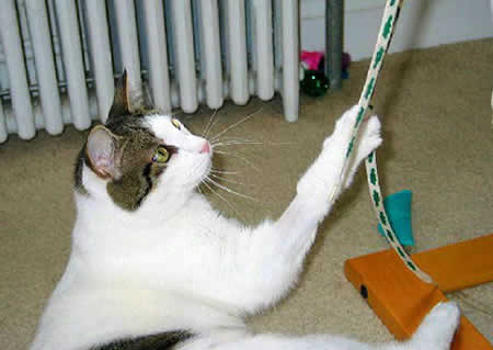 Here's Harry playing with his favorite shoestring. He never seemed to get tired of seeing what he could do with it.